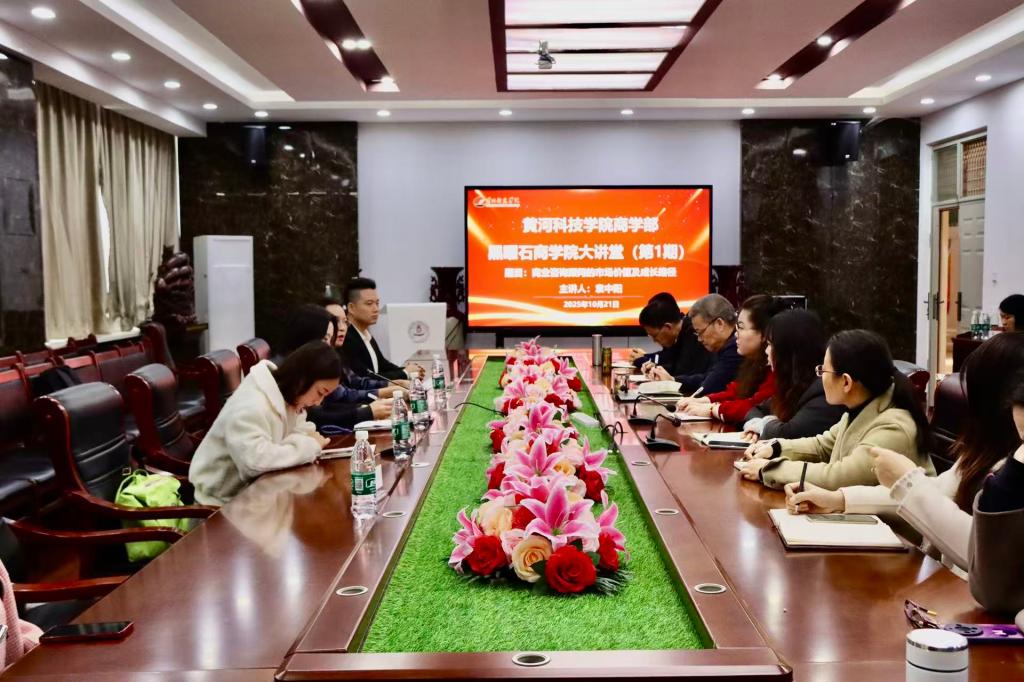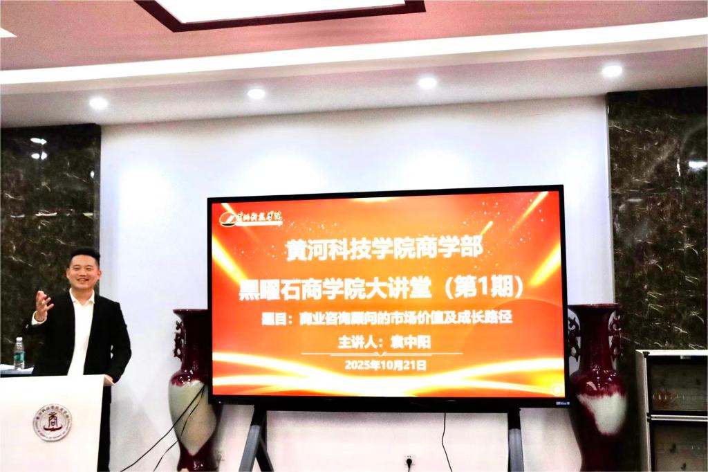 2025年10月21日,黄河科技学院商学部黑曜石商学院大讲堂(第1期)在商学部129会议室开讲。黑曜石商学院常务副院长、河南黑曜石咨询有限公司总经理袁中阳作“商业咨询顾问的市场价值及成长路径”主题报告,报告会由商学部副书记副部长、黑曜石商学院执行院长王晓梅主持。