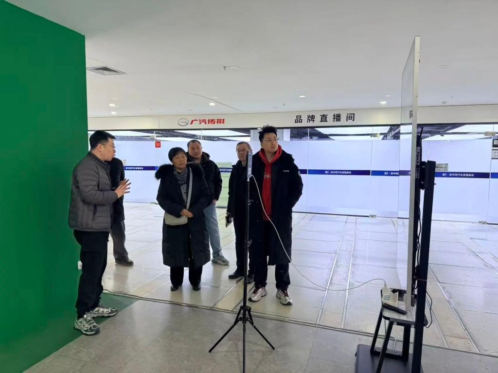 嗨购科技事业部部长杨宏伟、和音科技负责人王旭、校企合作部经理郭海亮热情接待了考察组,并全程陪同走访企业大型汽车品牌直播基地,先后参观了综合直播间、AI技术展示区、运营指挥中心及企业文化展厅。考察过程中,杨宏伟总经理结合企业发展实际,详细介绍了公司在汽车新媒体营销领域的战略布局,王旭则重点演示了以“播霸AI机器人”为核心的智能直播技术,包括数字人直播、AIGC短视频创作、直播数据复盘等七大核心产品的应用场景,全面展现了AI技术对汽车直播全流程的赋能能力。考察现场,阎爱武近距离观摩了企业主播团队的实战直播过程,详细询问了汽车直播的话术设计、场景搭建、留资转化等关键环节,对企业“数据驱动优化、合规风控保障”的运营模式及在沉浸式直播体验方面的创新实践给予高度评价。
