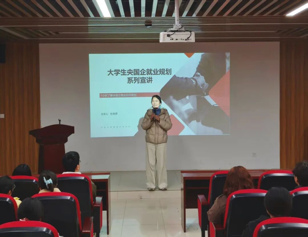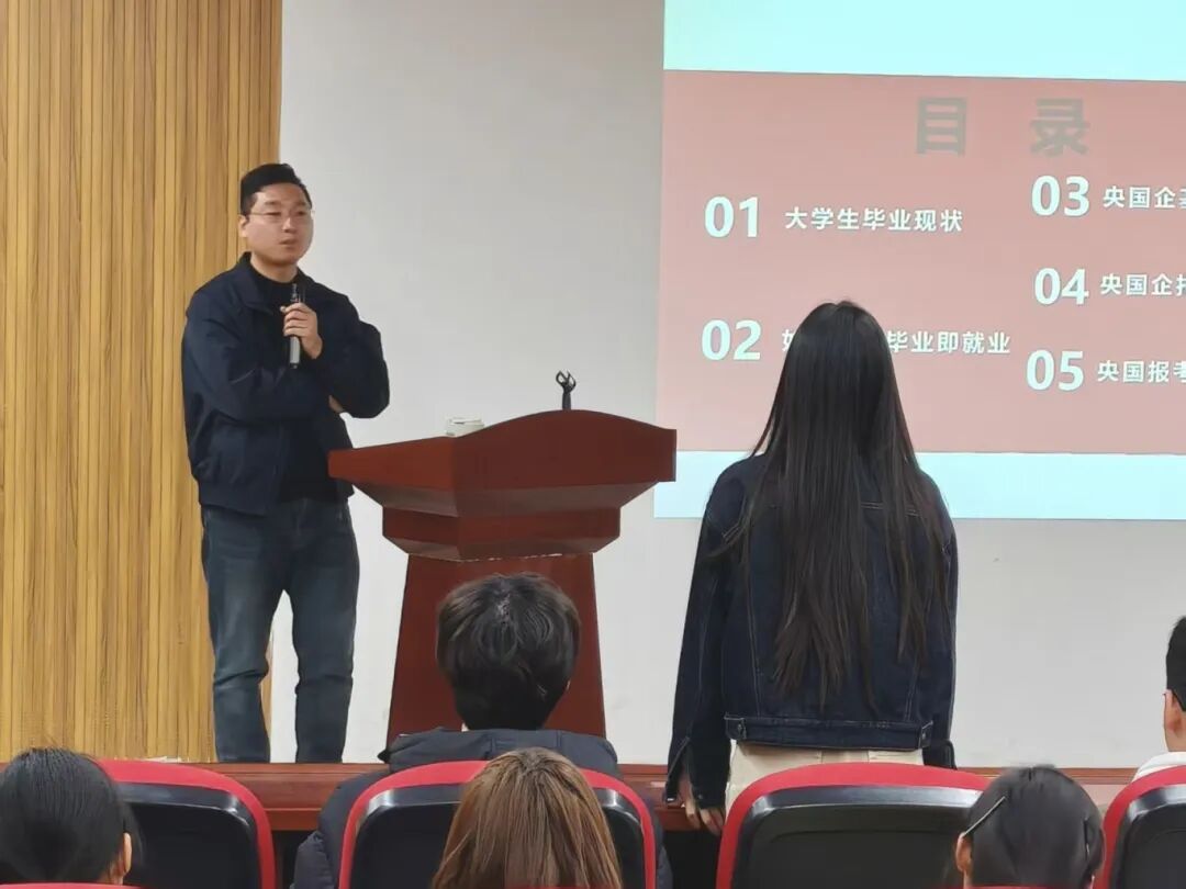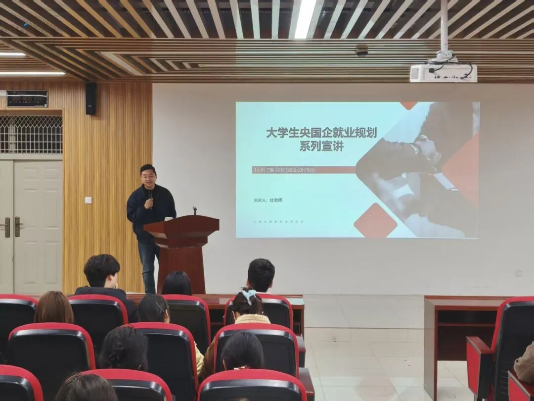 讲座中,主讲人杜老师围绕五大模块进行系统讲解。杜老师首先分析了当前大学生毕业现状,指出就业市场竞争态势与发展机遇;围绕“毕业即就业”目标,谈到了职业规划、能力提升与信息获取的重要性,提出分阶段、分目标的备考与提升要求。随后,杜老师详细介绍央国企基本属性、行业类别与就业优势,系统解读央国企招聘条件、招聘渠道与用人标准,明确学历背景、专业匹配度、综合素质等核心任职要求,帮助学生清晰认知岗位适配标准。