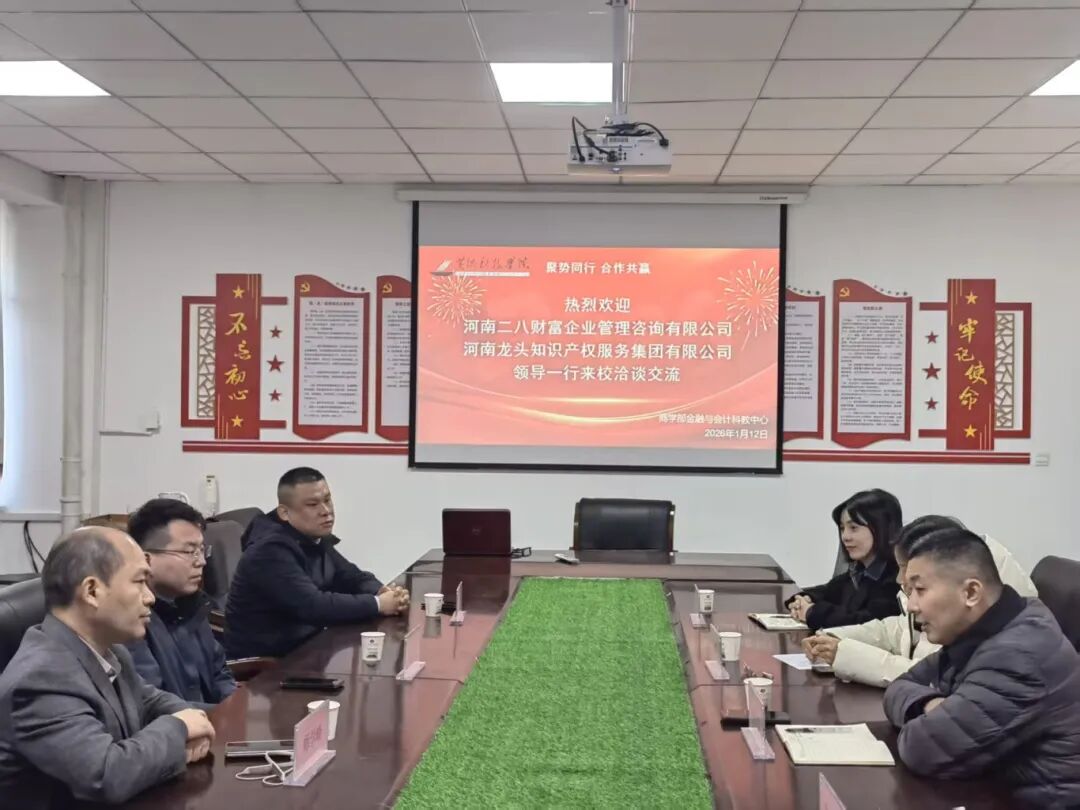 1月12日上午,商学部金融与会计科教中心校企合作交流会在学部110会议室圆满召开。本次会议以深化产教融合、推进协同育人为目标,邀请河南二八财富企业管理有限公司、河南龙头知识产权服务集团有限公司两家企业代表来校洽谈交流,商学部部长助理朱会芳、产教融合办主任常永佳、金融与会计科教中心副主任何海霞及中心教师牛斐斐共同参会,共商人才培养创新模式,探寻合作契机。
