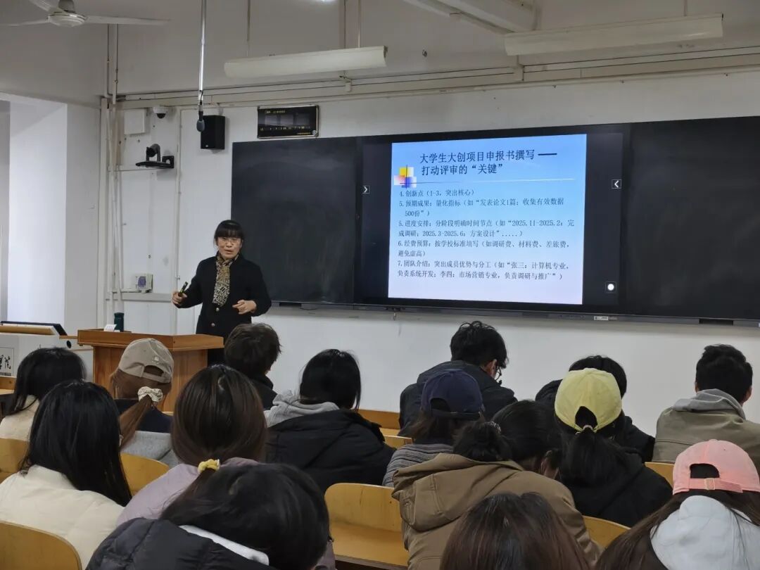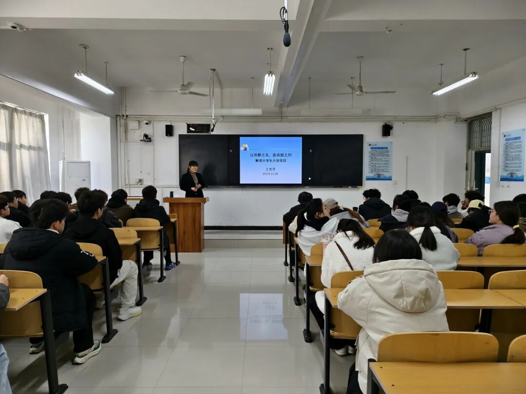 讲座伊始,王雪芹系统阐释了大学生创新实践项目的时代价值与育人内涵,深入解读学校在强化创新能力培养与推进学风建设方面的政策精神,强调“以项目促学习、以实践强能力”是锤炼综合素质、赋能学生发展的重要路径。随后,她围绕“大创项目核心价值”“项目分类解析”“申报基本条件”“选题原则与方法”等关键维度展开讲解,结合校内外优秀立项案例,全面梳理从构思、方案打磨到材料准备、终审立项的全流程重点环节,为学生厘清操作逻辑,针对性解答常见问题,切实提升了学生的项目申报能力。