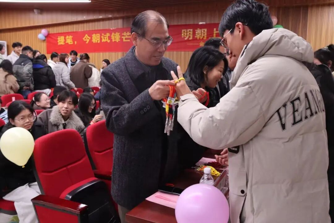 互动环节成为大会的暖心亮点。领导与老师们亲手为学子们系上红色“上岸绳”,赠送寓意“马到成功”的上岸金马,红绳系腕、金马在手,不仅是“鸿运加持”的美好祝愿,更让学子们感受到沉甸甸的期望,进一步强化了冲刺必胜的信念。随后,惊喜闪现的励志歌曲《云端相见》瞬间点燃现场氛围,悠扬的旋律与励志的歌词传递出“顶峰相见”的约定,让学子们在歌声中汲取奋进力量。