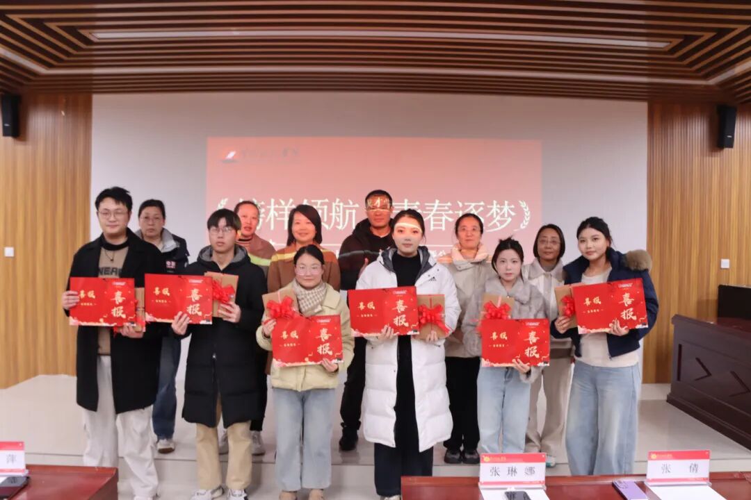 视频播放完毕后,进入颁奖环节。韩瑞萍副书记、张琳娜主任等领导上台,为刘才、张也、张静茹、任爽4位国家奖学金获得者,焦奥帅、张也、吉慧怡3位励志成才大学生获奖学子颁发奖品与喜报,并合影留念。
