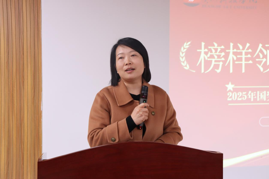 分享结束后,商学部分党委副书记韩瑞萍上台讲话。她首先对所有获奖学子表示热烈祝贺,肯定了他们在学业、实践中的不懈努力与突出成就,随后向2025级新生提出殷切嘱托:希望同学们以榜样为领航,坚定理想信念,脚踏实地深耕学业,勇于突破自我,在青春赛道上锤炼品格、增长才干,不负韶华、不负时代。据悉,学部将会把获奖学子的喜报邮寄至其家中,让其与家人共享这份荣耀。此次表彰暨分享会的举办,不仅是对先进学子的表彰与激励,更凝聚了商学部学子的奋进力量,为营造勤学善思、争先创优的良好学风奠定了坚实基础。