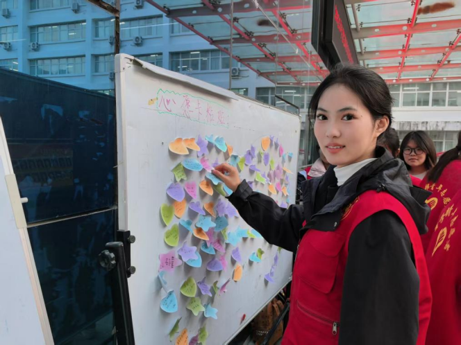 刚种完花的同学凑到书写区,趴在桌上,在彩色便签纸上写写画画。有人祝愿:“我爱的人如同我的花一样向阳、肆意地生长,爱我的人永远平安顺利。” 有人希望:“四级通过,减肥成功。” 志愿者把写完的卡片一张张贴在花台旁的展板上,没一会儿,这面 “心愿墙” 就缀满了五颜六色的小梦想。