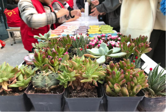 摆放花盆的桌子前前围了不少人,苗云和刘雯靖指着桌子上的花盆儿吆喝:“同学们,快来看看!每个花盆都等着你们来给它安个家呢!” 有同学拿着两个花盆比对半天,最后抱着蓝色的那个笑:“就它了,看着特亲切。”