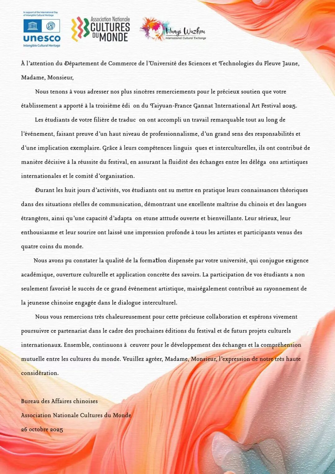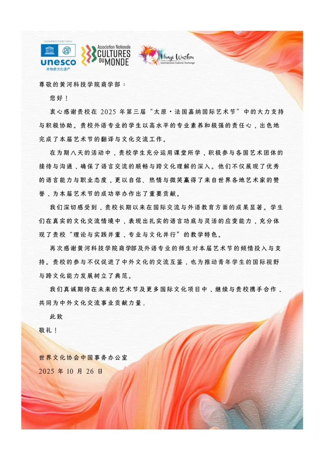 近日,黄河科技学院商学部收到世界文化协会中国事务办公室发来的感谢信,该校外语专业学生在2025年第三届“太原·法国嘉纳国际艺术节”中担任志愿翻译与文化交流工作,凭借高水平专业素养与极强责任心,赢得了活动主办方的高度赞誉。