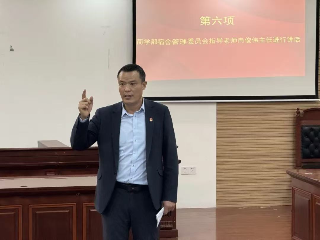 随后,商学部宿舍管理委员会指导老师冉俊伟在总结讲话中,对宿管会以往在宿舍卫生整治、安全管理等方面取得的成绩给予充分肯定,再次强调宿舍管理工作对学生成长和校园稳定的重要意义。他明确提出接下来的工作目标:全力消除学部“最差”宿舍,积极争创文明宿舍,并着重强调了定岗干部在宿舍管理中的关键作用,要求大家认真履职,压实责任,全力以赴迎接本科教育评估,以评促建、以评促改、以评促强、评建结合、重在建设,真正把学校倡导的宿舍“家文化”和宿舍文化育人落在实处。共同打造学部“规范、整洁、无隐患”的优美宿舍环境。大会最后,各中心主任为新一届宿管会干部颁发聘书,并合影留念。镜头定格下这一温馨而庄重的时刻,也标志着商学部宿管会换届工作圆满完成。