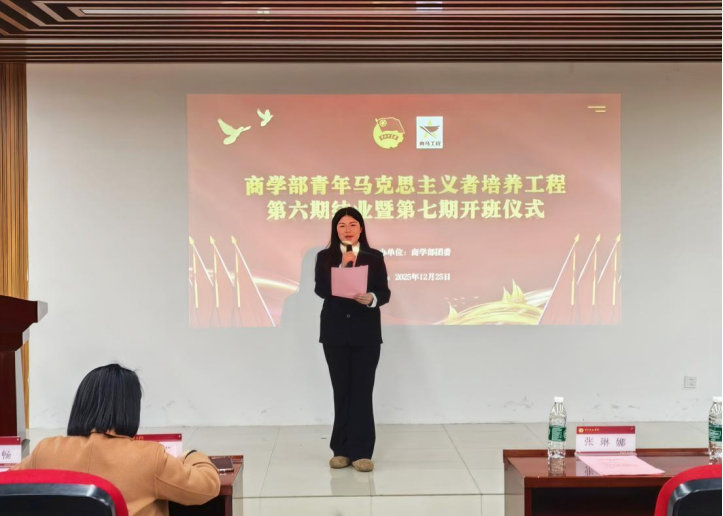 为培养一批具有坚定的马克思主义信仰、深厚的家国情怀、过硬的综合素质的青年骨干,使其成长为中国特色社会主义事业的合格建设者和可靠接班人。12月25日,商学部青年马克思主义者培养工程第六期结业暨第七期开班仪式在商学部114报告厅隆重举行。商学部分党委副书记韩瑞萍,商学部党政学工办常务副主任张琳娜,商学部团委书记陈晨,经济与管理科教中心主任助理姜舒畅,法学科教中心主任助理尹勇超,商学部团委副书记、外语科教中心团总支书记刘思妍,金融与会计科教中心团总支书记魏飞以及“青马工程”培训班第六期、第七期全体成员参加,仪式由梁静丽主持。