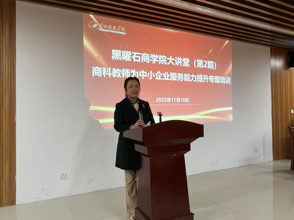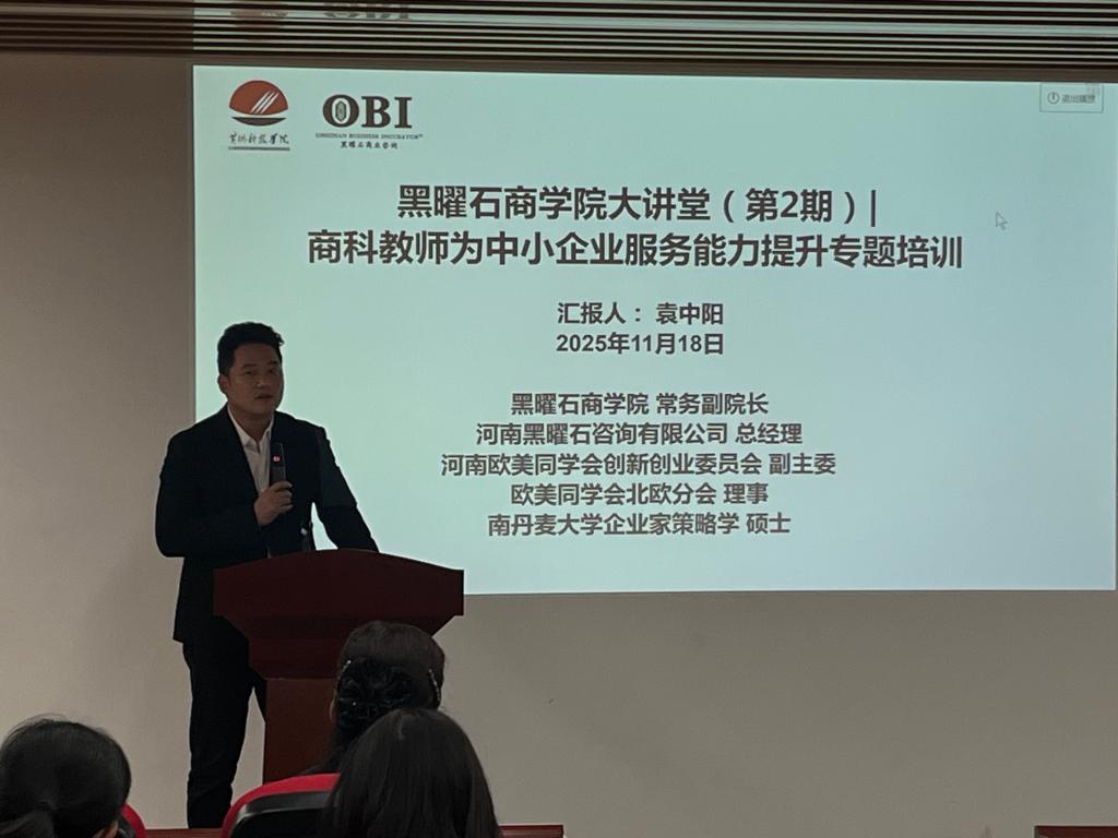 11 月 18 日下午,黄河科技学院商学部黑曜石商学院大讲堂(第2期)“商学部教师中小企业服务能力提升”专题培训在商学部114报告厅举行。本次培训由商学部副书记、副部长、黑曜石商学院执行院长王晓梅主持,河南黑曜石咨询有限公司总经理、黑曜石商学院常务副院长袁中阳担任主讲,100余名教师参加。