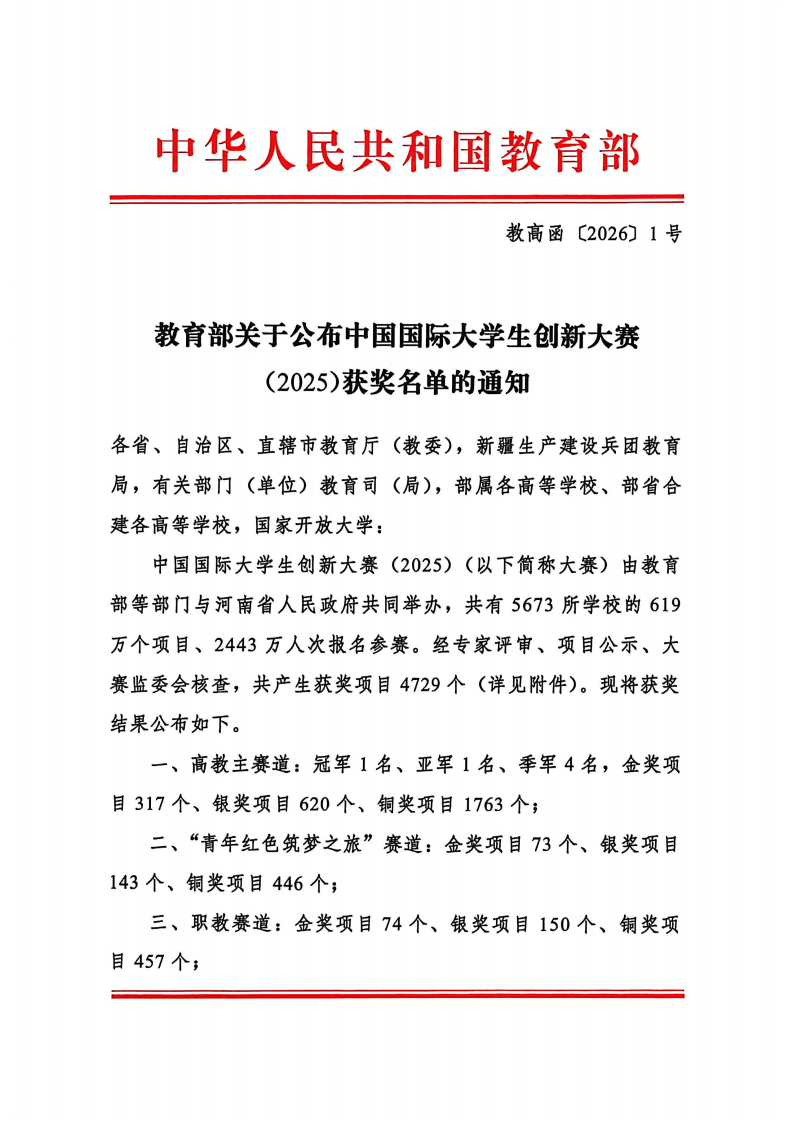 中国国际大学生创新大赛自2015年创办以来,已成为我国最具影响力、规模最大的大学生创新创业竞赛,赛事成绩是高校综合办学实力的重要体现。据悉,本次大赛共有国内外161个国家和地区5673所学校的619万个项目、2443万人次参赛,覆盖人工智能、芯片技术、生物医药等前沿领域。