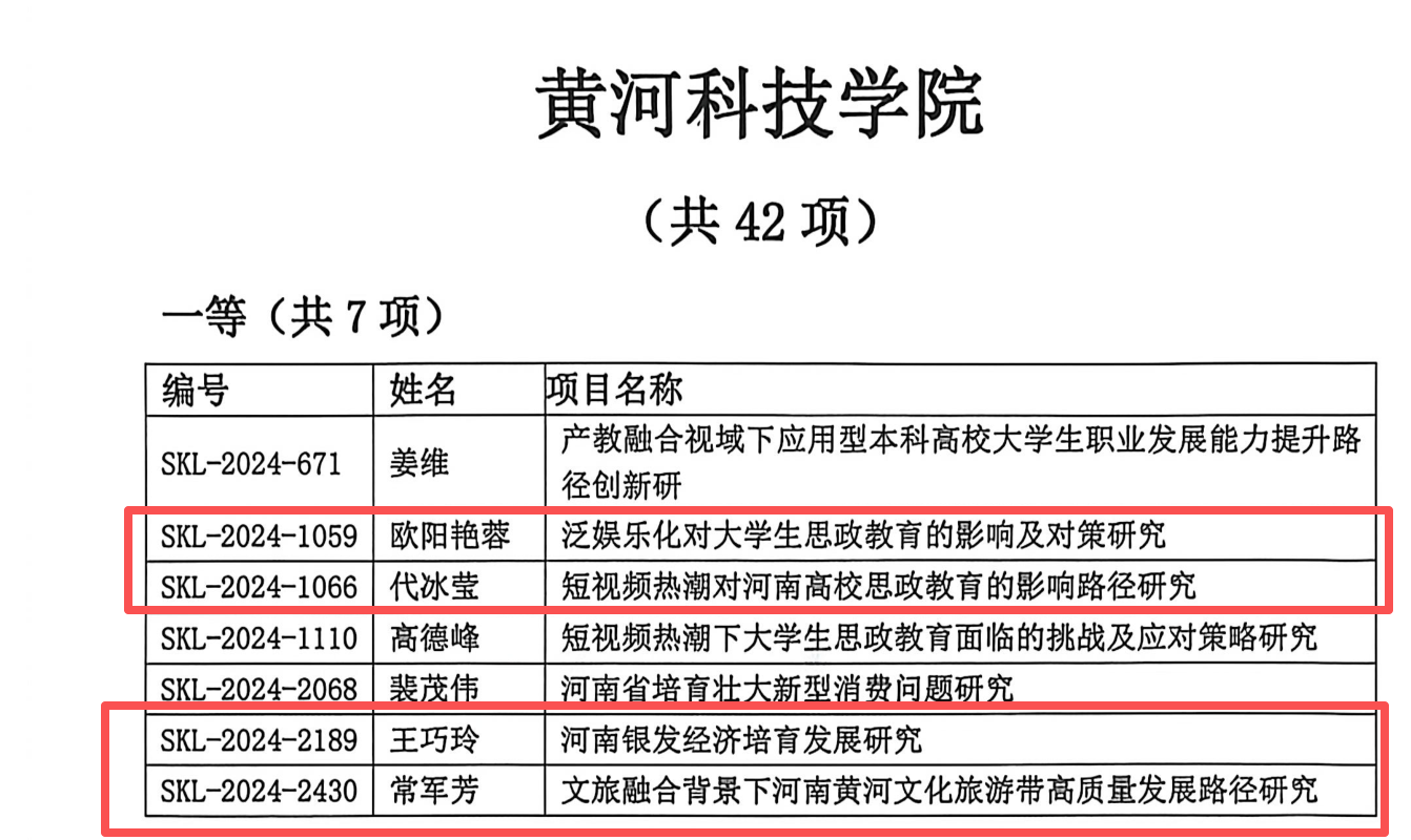 根据河南省社会科学界联合会《关于2024年度调研课题评审情况情况的通知》豫社科联字[2025]16号文件,商学部欧阳艳蓉、代冰莹等19位老师顺利结项,其中欧阳艳蓉、代冰莹、王巧玲和常军芳4位老师获批结项一等。