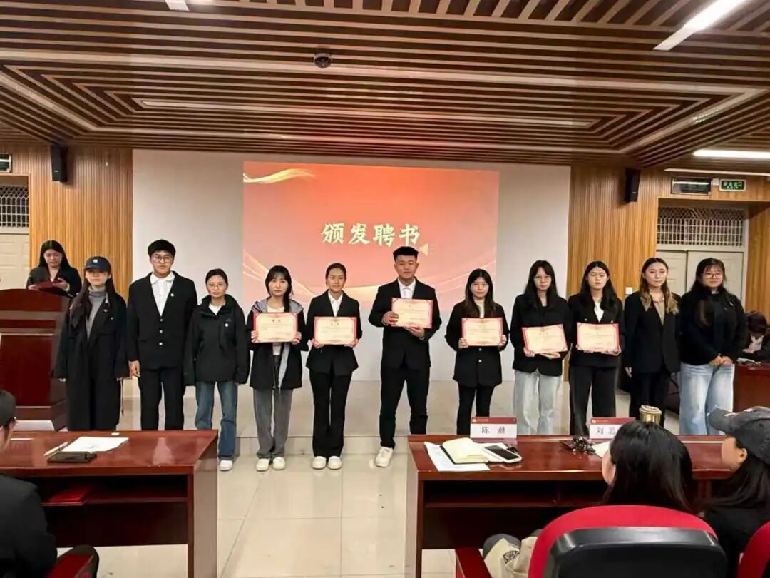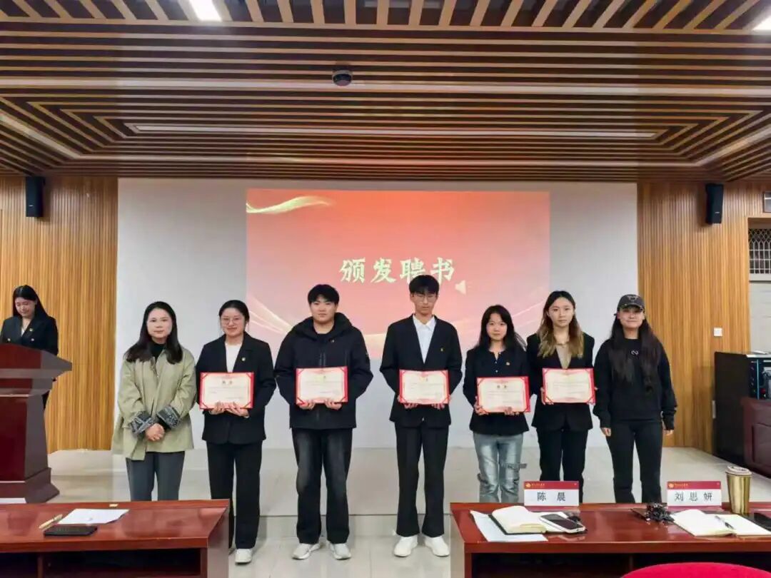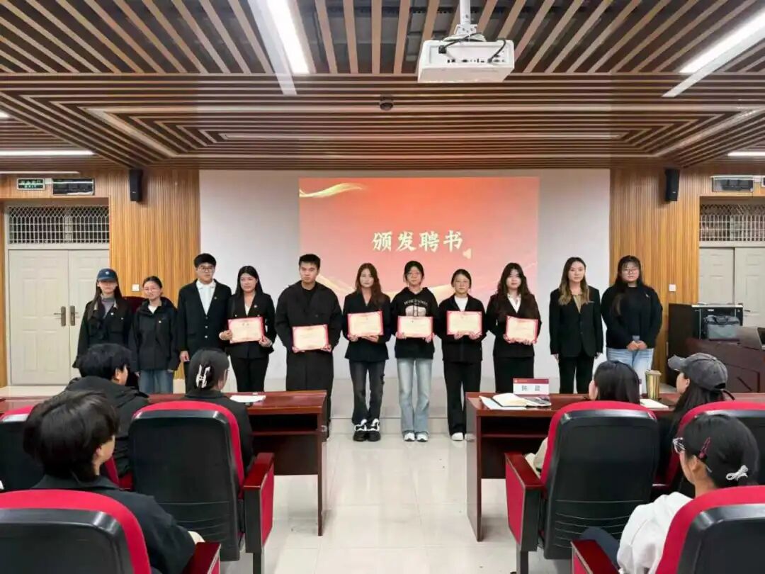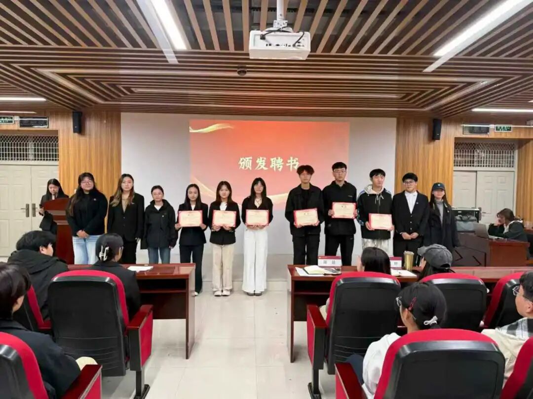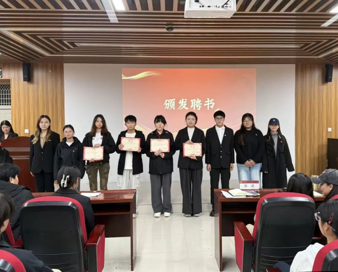 由两位书记老师为新一届书记团:张铃、王铱果、黄俊涛、李书恒、张佳乐、陈雪保颁发聘书。并由上一届书记团为新一届部长颁发聘书。接过红彤彤的聘书,每位干部成员脸上洋溢着自豪与激动的神情,同时也感受到了肩上的责任与使命。