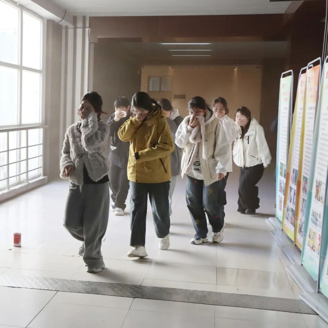 随着清脆的口哨声响起,疏散演练正式启动。同学们手持折叠好的半干毛巾捂紧口鼻,低头弯腰沿楼道右侧有序行进,不拥挤、不赶超。各引导人员实时疏导,确保疏散过程快速规范、井然有序。
