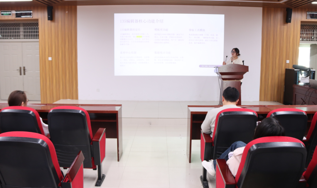 培训伊始,由校融媒体记者团黄大丫工作室成员刘烨主讲,主题为“新闻稿撰写与135编辑器实操”。她系统阐述了新闻稿从策划到成稿的全流程,包括明确目标受众、高效搜集整理素材、搭建逻辑框架及锤炼语言风格等关键环节。在实操演示部分,刘烨重点讲解了135编辑器的核心功能,现场演示了排版设计、快捷操作与一键美化等技巧,有效提升了文稿编辑的效率和视觉呈现的专业度。