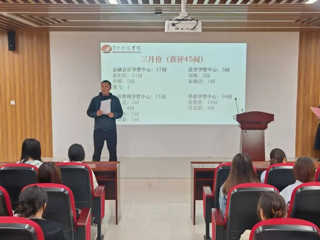 会议伊始,冉俊伟作2026年3月份宿舍工作全面汇报。汇报中,冉俊伟对同学们在宿舍卫生清扫、安全规范遵守、宿舍氛围维护等方面付出的积极努力予以肯定,对宿舍在文明创建中展现出的良好精神风貌给予高度认可,也对15间连续四次获评2025—2026学年文明宿舍的宿舍做出重点表扬。同时,针对本月日常检查中发现的卫生死角清理不彻底,文明宿舍打卡拍照的次数、要求等问题,逐一进行剖析,并提出了针对性的整改要求与后续改进方向,叮嘱各宿舍严格落实宿舍管理各项规章制度,切实提升宿舍管理水平。随后,张婉茹宣读2026年3月份文明宿舍获奖名单,本次共评选出45间文明宿舍,其中金融与会计中心17间、经济与管理中心11间、法学中心3间、外语中心14间。宣读完毕后,冉俊伟依次为获奖宿舍代表颁发荣誉证书和奖品,并对所有获奖宿舍表示热烈祝贺,希望获奖宿舍能够珍惜荣誉、再接再厉,持续发挥模范带头作用;同时鼓励学部全体学生以先进为标杆、以典型为榜样,主动参与宿舍环境打造,携手共建温馨舒适、积极向上的宿舍家园。最后,全体获奖宿舍代表与参会老师共同上台合影留念,用镜头定格这份荣誉与喜悦,为本次表彰大会画上圆满句号。