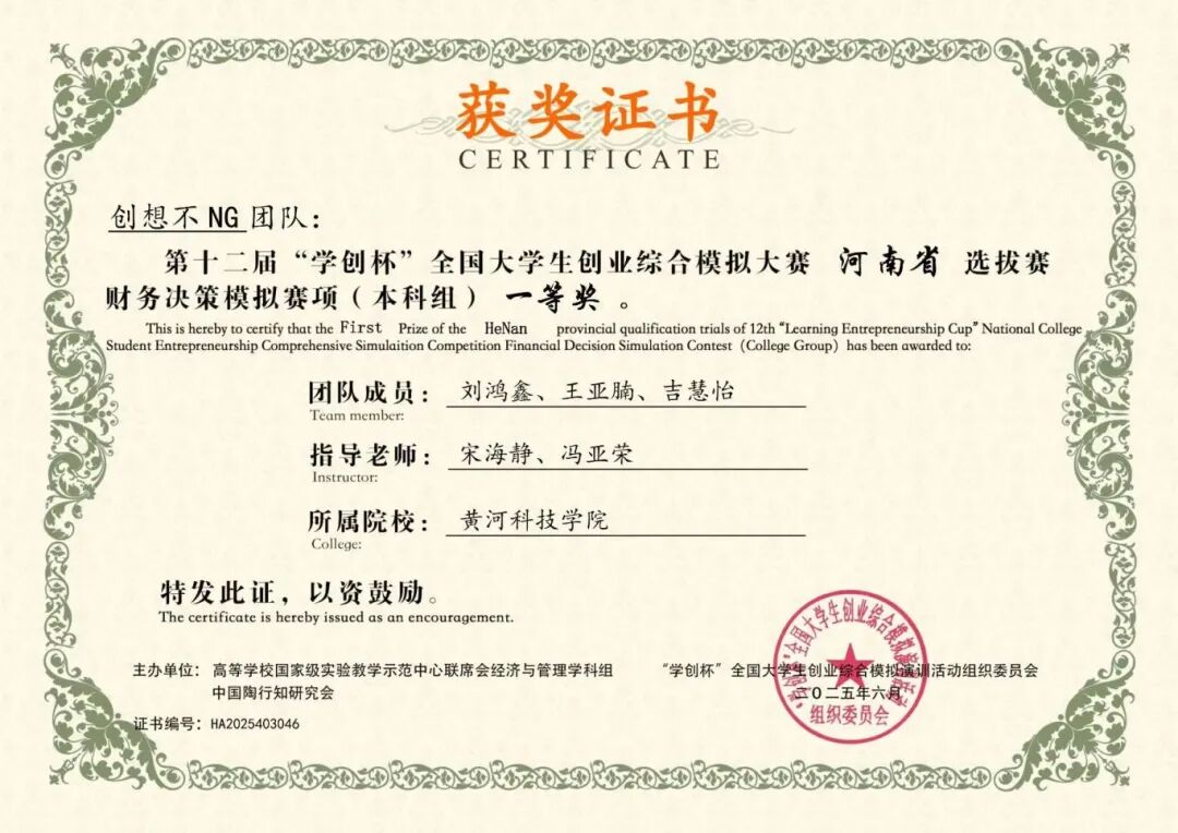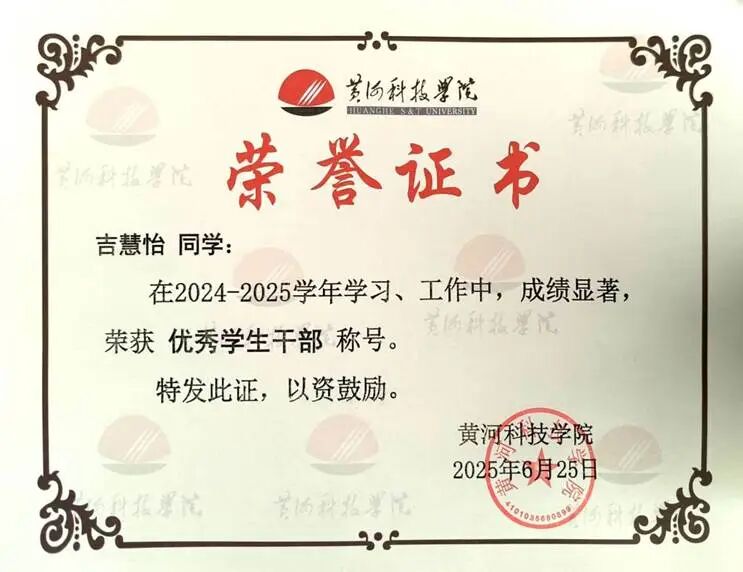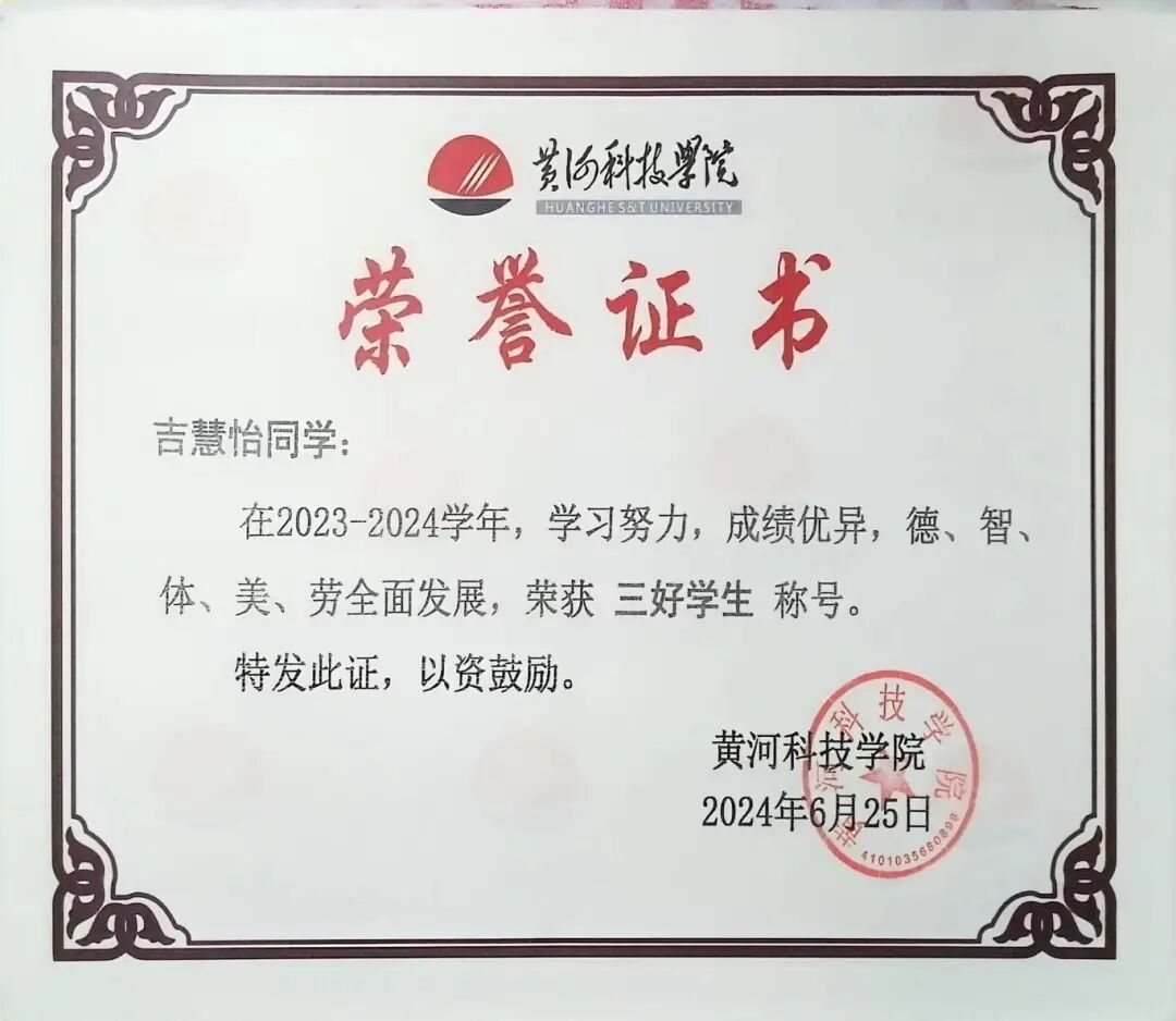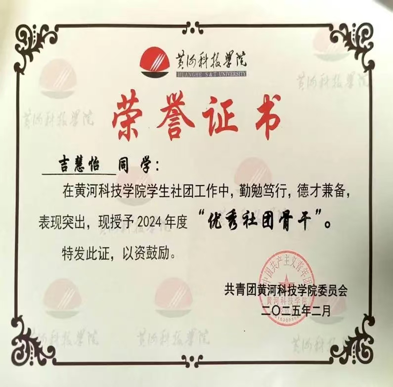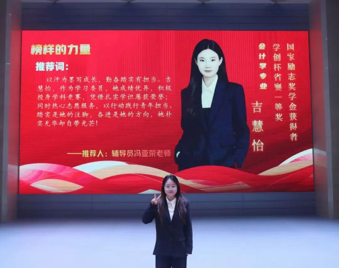 个人简介 吉慧怡,女,共青团员,黄河科技学院商学部2023级普本会计学专业,现任学习委员、学生资助宣传大使、商学部青马班组织委员等多项职务。荣获国家励志奖学金两次、校级一等奖学金,“学创杯”省赛一等奖,“衡信杯”省赛二等奖、“中国国际大学生创新大赛”省赛三等奖、“一带一路暨金砖大赛”省赛优秀奖、三创赛校赛一等奖等,参与大创项目1项。深耕社会实践,以服务社会为己任,累计服务时长超300小时,荣获暑期三下乡“先进个人”、校级优秀共青团员、三好学生、优秀学生干部、优秀大学生志愿者等称号。