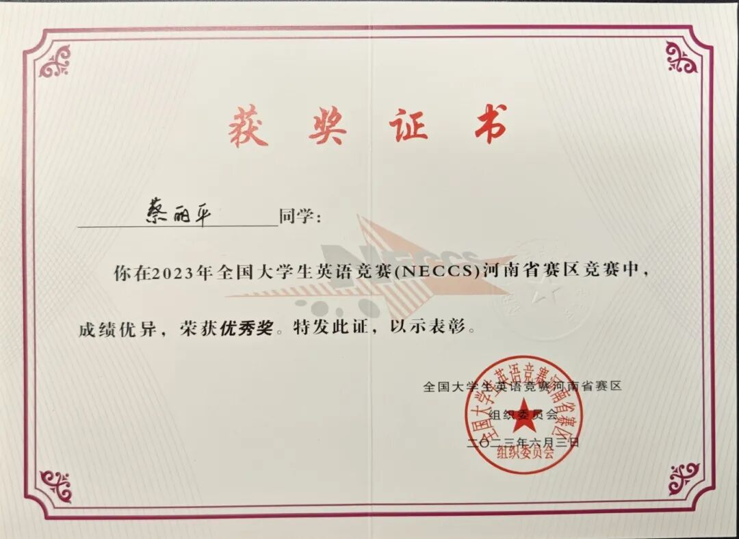 蔡丽平,女,群众,商学部2022级普本英语专业,现任22级英语三班心理委员。专四良好,获两次校级奖学金、大英竞赛省优秀奖、“21世纪杯”英语演讲比赛三等奖、“跨时空对话”演讲比赛三等奖、心理情景剧大赛校三等奖和最佳剧本奖、心理微视频大赛校优秀奖、三下乡“先进个人”、卢氏县“扬帆计划”优秀志愿者。
