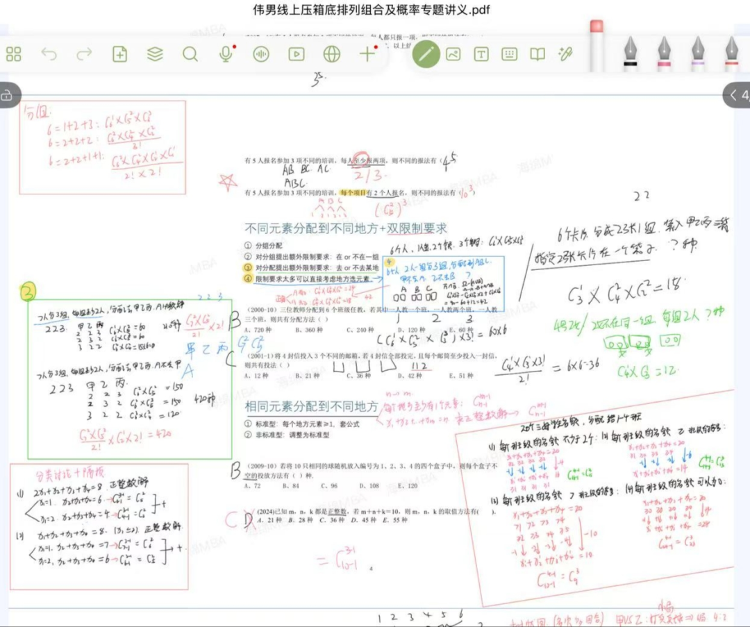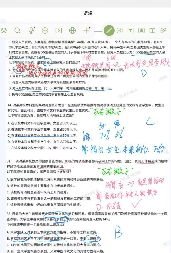(2)管综逻辑:一轮学习跟随李焕老师,先快速入门各类逻辑题型,自我感觉效果一般,我没办法学以致用,基本做题都是凭着感觉来;直到二轮切换至老吕的课程,补了很多漏洞,他的做题方法很容易掌握的。完成两轮课程学习后,我不再专门听课,转而以刷题为主,通过大量真题、模拟题练习,巩固知识点、总结解题技巧,形成自己的解题逻辑。