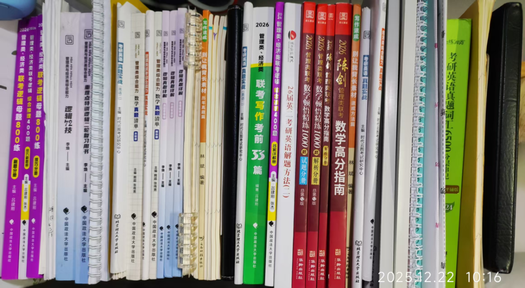 (1)管综数学:直接以《高分指南》为核心教材,跟随朱曦老师完成三轮系统学习。朱曦老师的课一遍听不懂的话,就重复听。八月进入强化阶段后,我转向海绵APP,跟随韩超、张伟男老师学习,海绵上有什么做题活动,都会参与。条充题我是在海绵上韩超的一个小程序上练的,每天两道题,直到考研前。最后冲刺阶段,重点跟学张伟男老师的压箱底课程,重新梳理知识点。